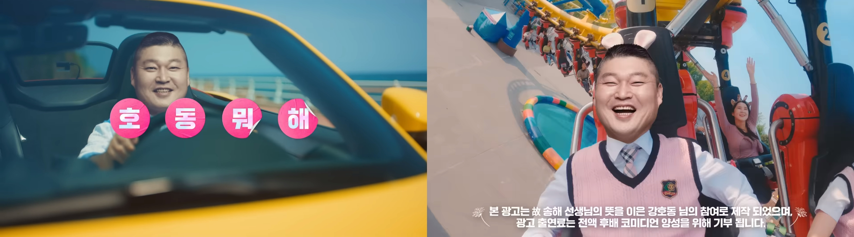 최근 ‘빛호동’의 클라쓰를 정점을 찍은 특별한 행보가 있습니다. 故 송해의 뜻을 이어받은 것인데요. 故 송해가 촬영했던 숙박 플랫폼 ‘야놀자’ 캠페인 광고가 무산 위기에 처하자 애도의 마음을 담아 두 팔 걷고 나섰습니다.